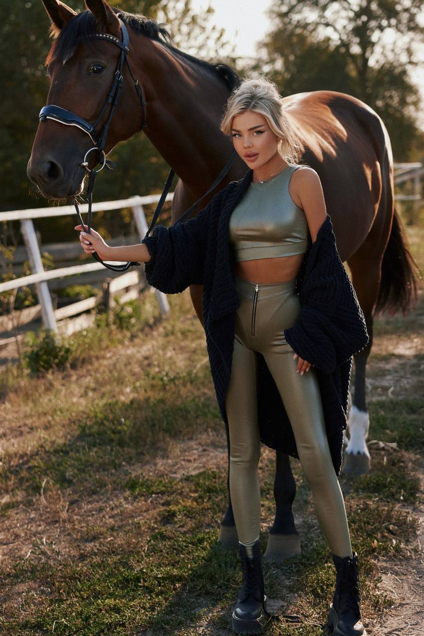 These khaki eco-leather leggings are the perfect blend of style and comfort. Designed with a figure-hugging fit, they accentuate your silhouette while offering a sleek and modern aesthetic. The soft, supple material ensures ease of movement, making them ideal for day-to-night looks. Pair them with a blazer for a sophisticated vibe or a cropped top for a bold, trendy outfit.