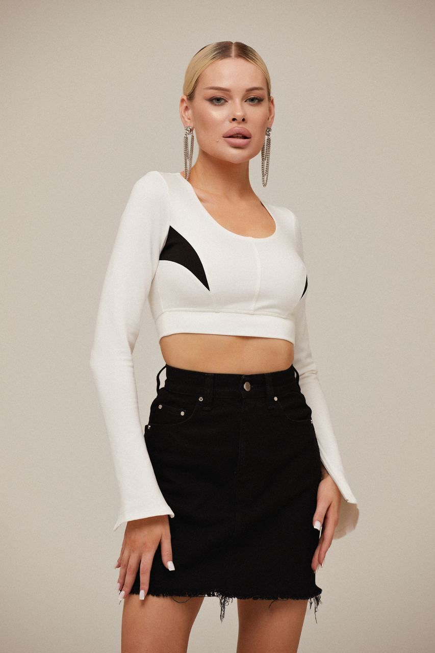 This stylish white crop top blends elegance with edgy details. Featuring a flattering scoop neckline and bold black accents, it adds a modern touch to any outfit. The long sleeves with statement zipper details bring a unique twist, while the fitted silhouette enhances your shape. Perfect for casual and dressy looks alike!